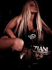 Busty blonde bombshell, Sophia Rossi, shows off her generous curves posing with the Aziani motorcycle in her tank top and shorts. Even better is when